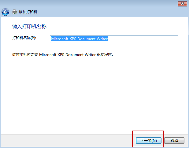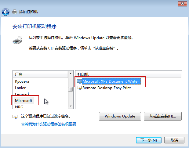 第五步,在厂商列表里选择Microsoft,打印机选择Microsoft XPS Document Writer,然后点击下一步
