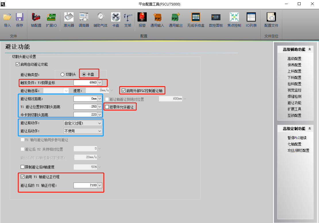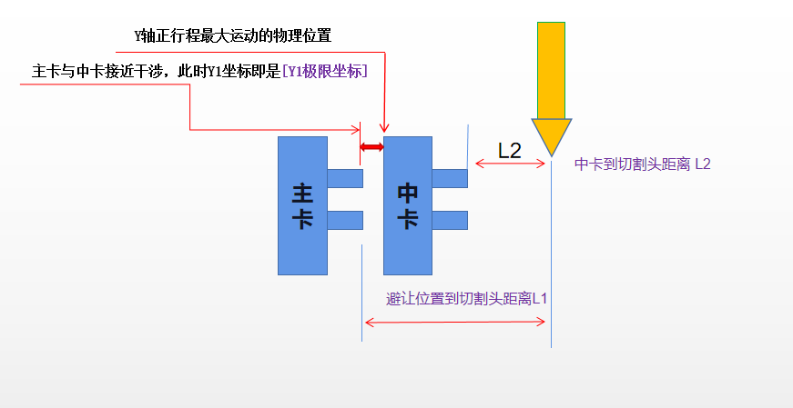 卡盘避让机型,增加的切割能力取决于中卡前推越过切割头后,主卡增加的额外Y轴行程,因此要启用Y1轴避让正行程并正确填写。