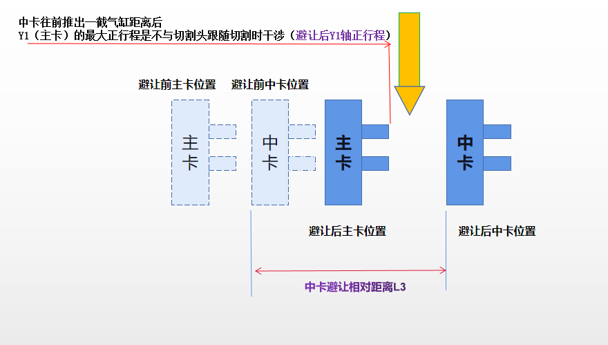 中卡避让后,主卡与中卡夹持切割的最短管材长度:避让位置到切割头距离(L1) + 中卡避让相对距离(L3) - 中卡到切割头距离(L2)。