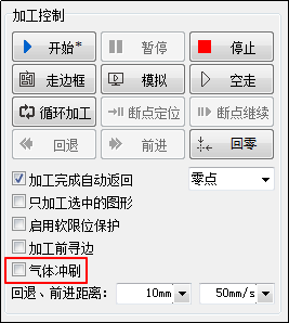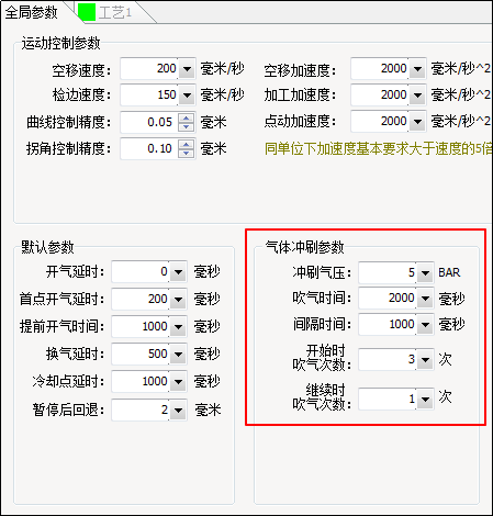 功能说明:启用气体冲刷功能后,会在开始/继续加工时,执行气体冲刷动作,确保气路中的气体纯净,气体冲刷参数在全局参数设置