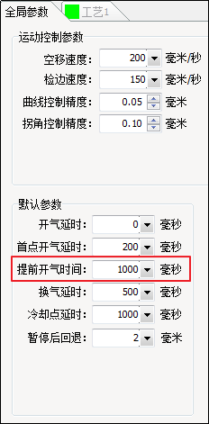 功能说明:全局参数新增提前开气时间,可以实现空移过程提前开气,使得空移到位后气压稳定,减少停顿时间。