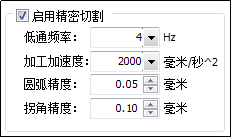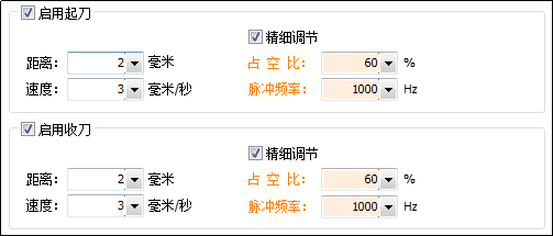 功能说明:可以单独设置起刀和收刀位置的距离、速度,启用精细调节以后,可以单独设置起刀、收刀位置的占空比和频率