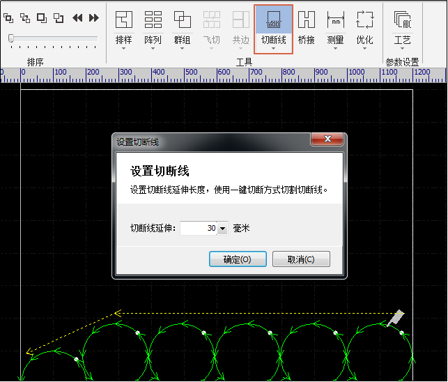 (2)选中曲线,然后点击切断线功能,设定切断线延伸长度后,即可生成黄色切断线(白色旗帜表示切断),切断线延伸长度代表在原有曲线基础上向板外延伸的长度,用来确保板材可以完全切断,黄色切断线使用的是最后加工图层工艺,加工之前请先设置工艺和实际加工板材一致;