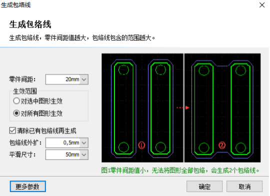 相比传统的走边框,区别在于包络线的边框运动范围更小,更贴近图形,主要用于在余料板材上切割,防止出现切到板材外造成损失。
